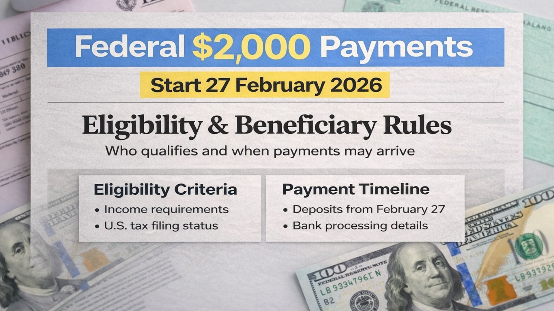 $2,000 Direct Deposit Program Starting 15 February 2026: What to Know Smriti Agarwal — February 17, 2026 Social Security 2026 Monthly Payment Increase Explained in Simple Terms Smriti Agarwal — February 17, 2026 Federal $2,000 Payments Start 27 February 2026, Eligibility & Beneficiary Rules Smriti Agarwal — February 17, 2026 IRS Today Announced $2,000 Direct Deposit for All in February 2026, Payment Schedule and Eligibility Smriti Agarwal — February 17, 2026 IRS Refunds Rolling Out in February 2026 – Full Payment Schedule Inside Smriti Agarwal — February 17, 2026 IRS Tax Refund 2026 Schedule: Expected Dates, Refund Amounts, and Processing Time Explained Smriti Agarwal — February 17, 2026 IRS Refund Timeline 2026: Fastest Way to Get Your Money Smriti Agarwal — February 17, 2026 IRS Tax Refund 2026 Schedule: Check Amounts and Estimated Refund Dates in the USA Smriti Agarwal — February 17, 2026 $2,000 Stimulus Checks Update For ‘All Americans’: Here’s The Latest Statement Smriti Agarwal — February 17, 2026 Previous 12345…7 Next